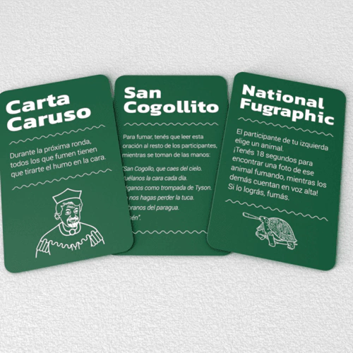 ¿Cómo se juega? Es muy simple: cada carta tiene una consigna para que fume uno, todos o nadie. Por ejemplo imitar a Shakira, rezarle a San Cogollito o hacer un Kame-Kame-Ha de humo. ¡Gana el que después de varias rondas fuma la última pitada!